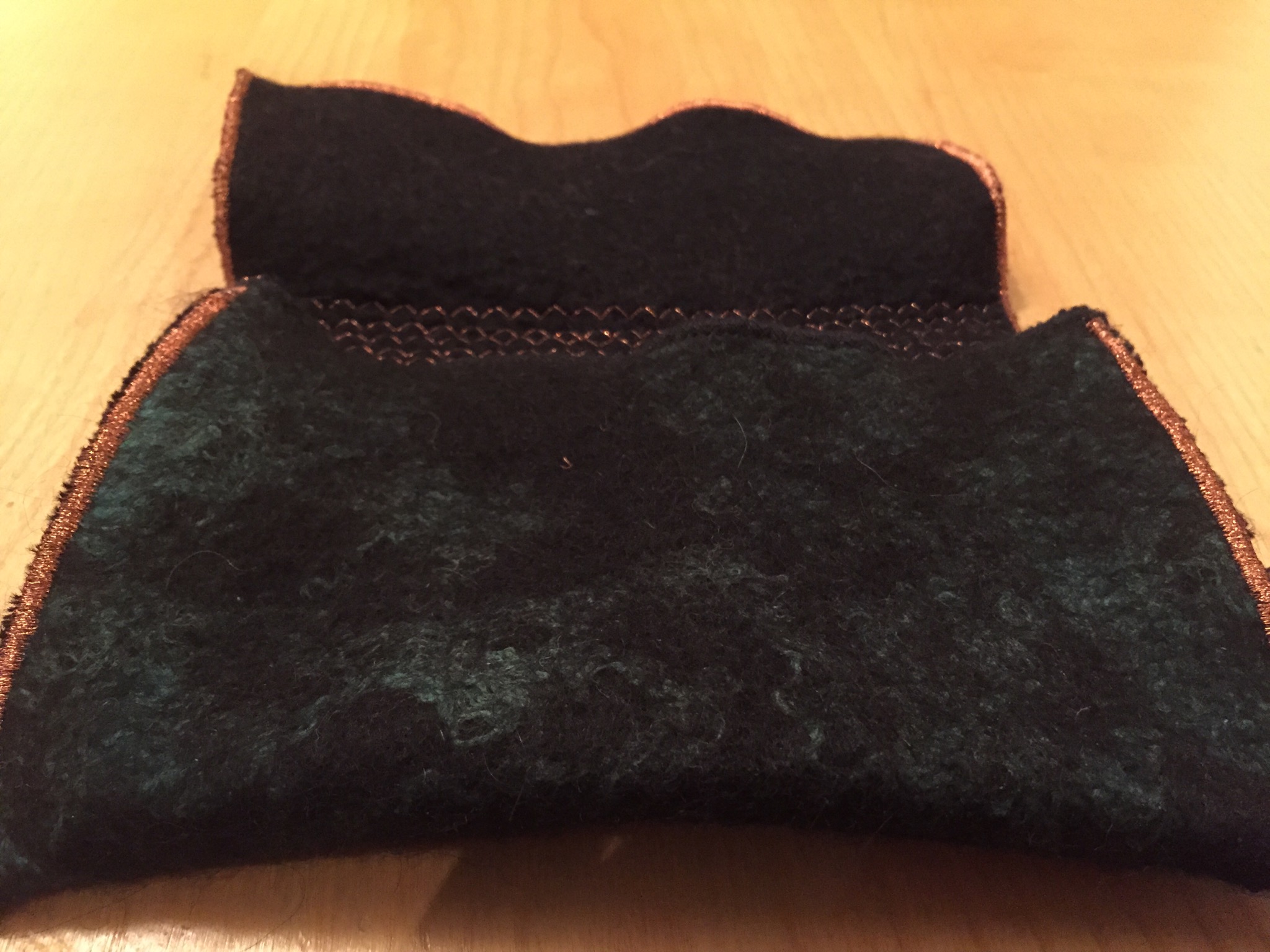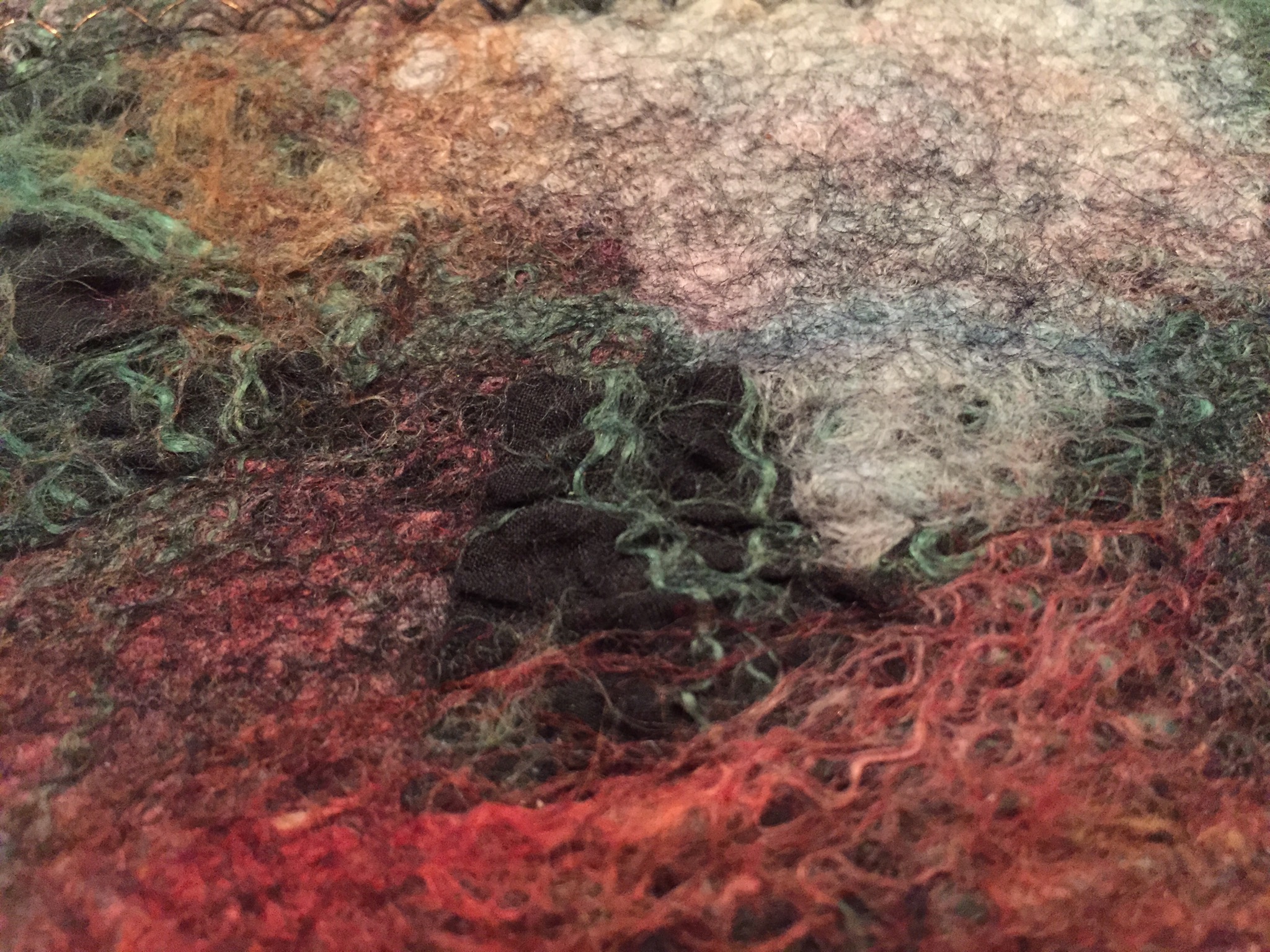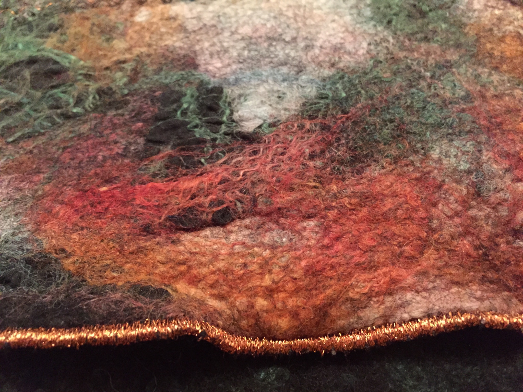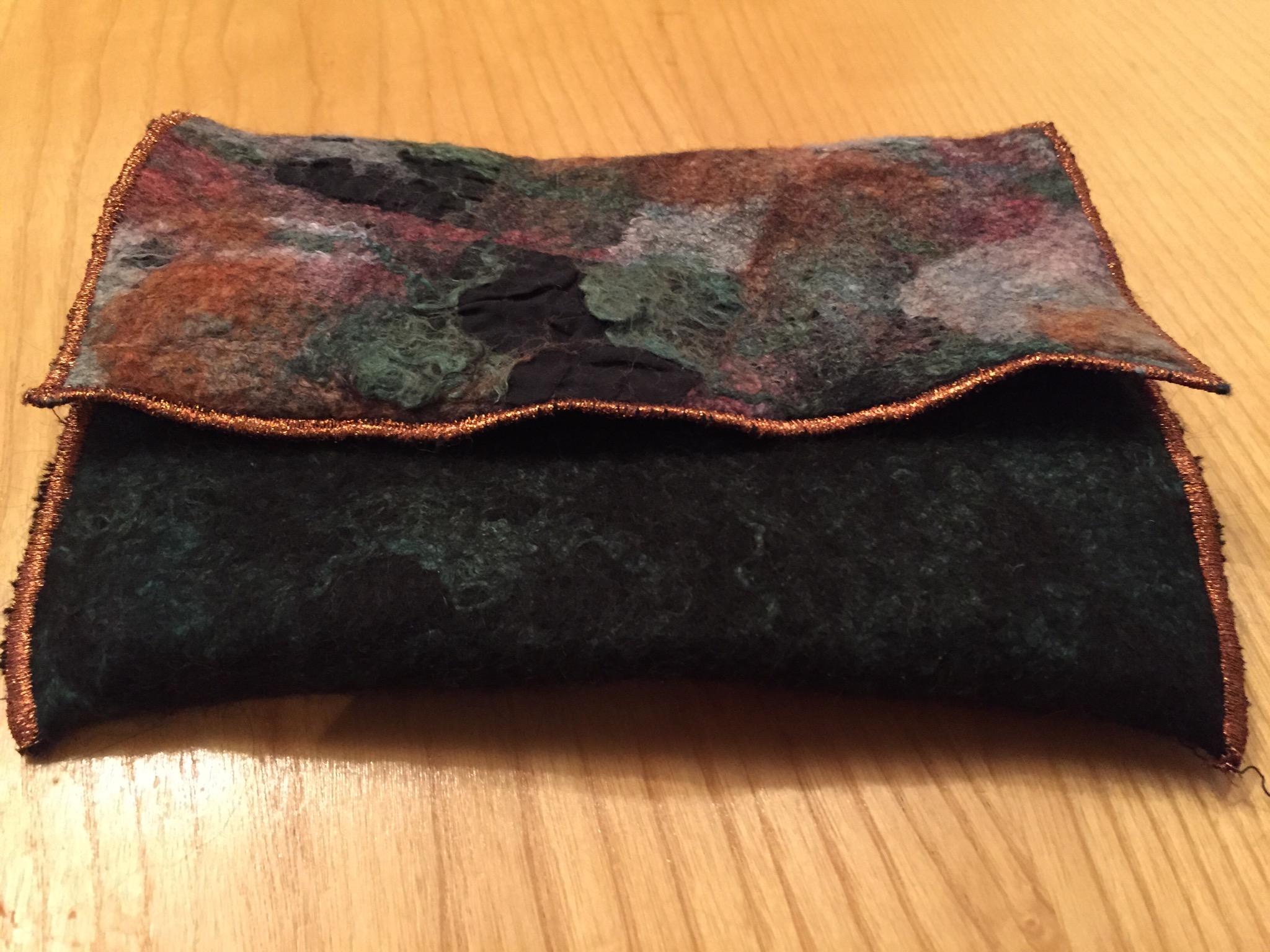A quick felted piece – a fun little felt gift purse made from alpaca, merino, different silk additions and metallic stitching to fill with chocolate coins as a stocking gift.