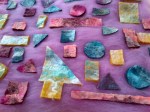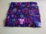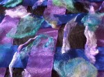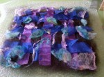 Piece uses hand-dyed silk hankies felted into several different merino colours to make cut shape pre-felts, then further felted into coloured merino tops.