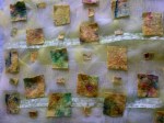 Piece uses gauzy ribbon, scrim and small pieces of silk hanky felted into natural Jacob wool tops.