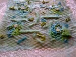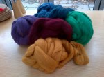 Piece uses felted knitting cut into ‘worms’, silk hankies, dyed merino locks, neps, green dress net and hand dyed merino tops.