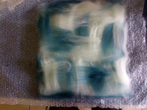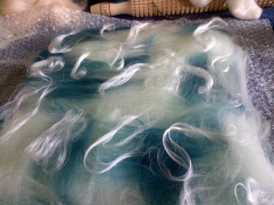 - now you need to lay the wool top fibre out in a mat inside the bubble wrap by taking a section of top, dividing and then spreading the fibres and pulling them out in three inch sections: