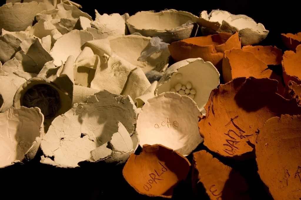 Her current work HOW TO BE STRONG is a mixed media art installation project. The central piece is a collection of ceramic bowls in varying states of fragility and strength, disintegration and wholeness.
